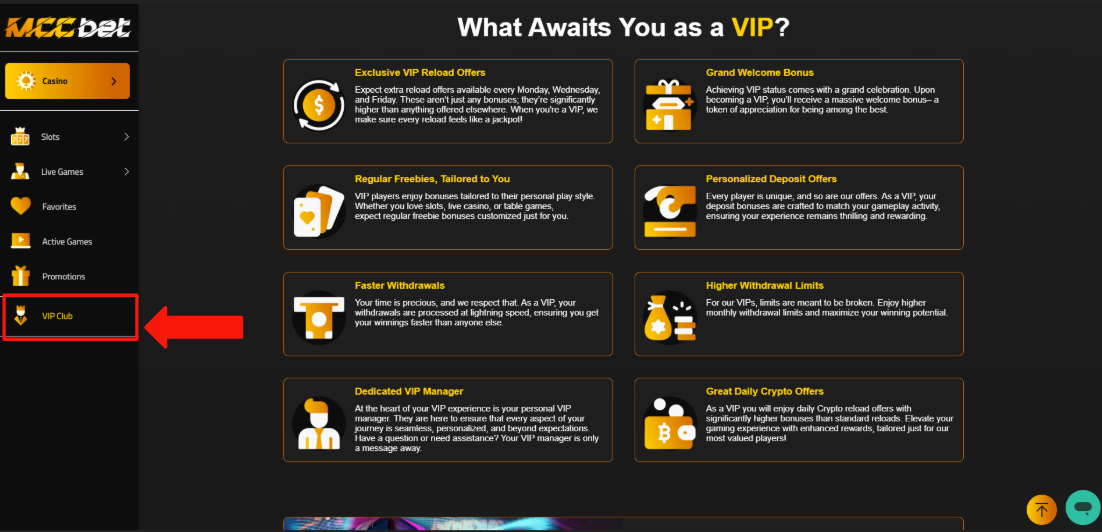 Unlock exclusive rewards and benefits with the MCC Bet VIP Club. As a VIP member, you gain access to special promotions, personalized support, and enhanced rewards, making your gaming experience even more exciting. The more you play, the higher you climb, and the better the perks become. Join the VIP Club today and enjoy the ultimate gaming experience!