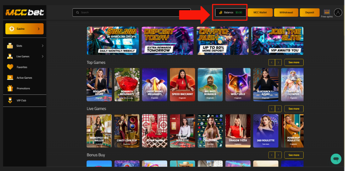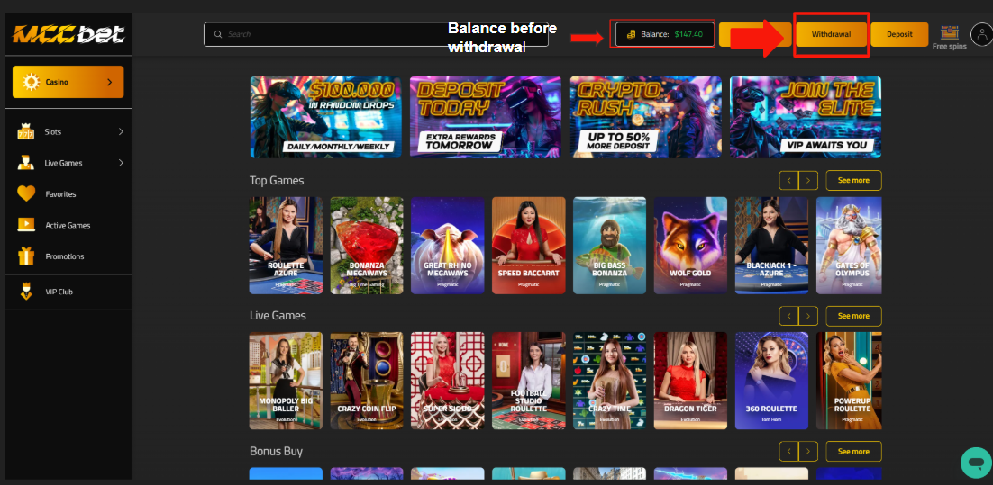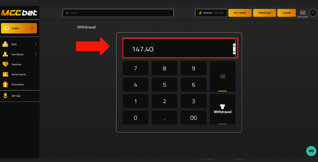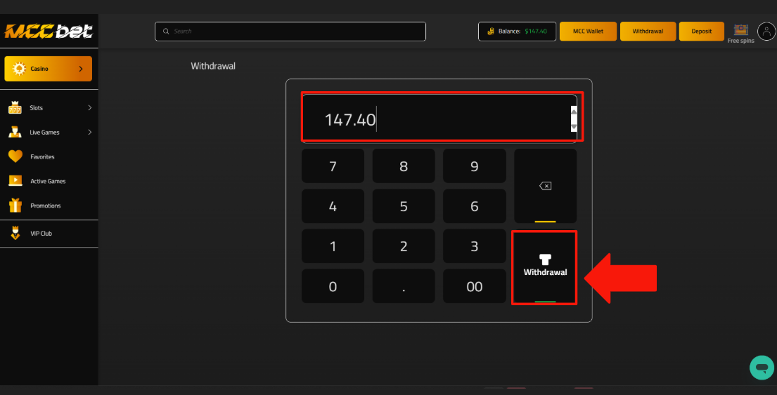 1. Click on "Withdraw": On the MCC Bet dashboard, find the "Withdraw" button and click on it to begin the process.