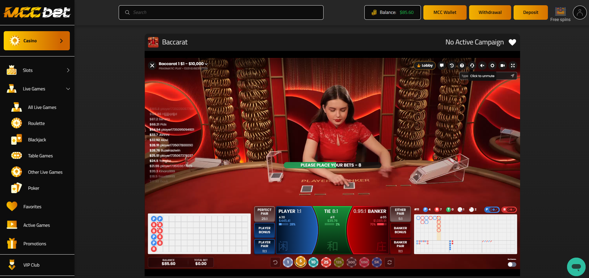 The Live Casino at MCC Bet brings you an immersive experience with real dealers running the games in real-time. You’ll have the chance to interact with professional, live-streamed dealers, just like you would in a physical casino. Whether it's the spin of the roulette wheel or the shuffle of cards, the excitement of a live casino is right at your fingertips, all from the comfort of your home.